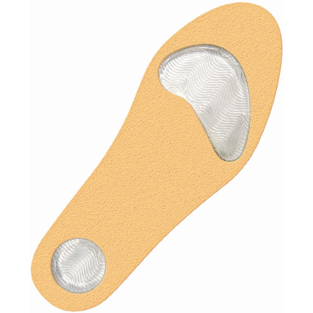 The gel insole, lined with soft padding and cushioning in the heel and metatarsal areas, provides relief from pain in the sole of the foot caused by excessive pressure or inadequate support. Its reduced thickness allows for use in virtually all types of footwear. It improves weight distribution across the foot, helps prevent calluses, and promotes greater walking comfort. It can be cut at the ends for a perfect fit.